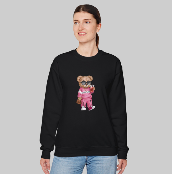 A stylish black sweatshirt featuring a trendy teddy bear in pink streetwear, combining comfort with urban flair.