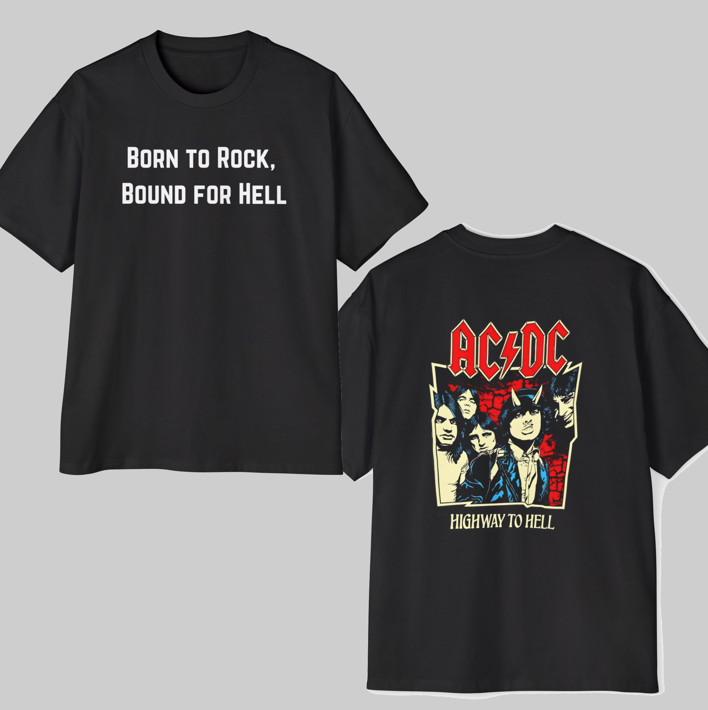 Rock your style with the ultimate tribute to AC/DC’s iconic “Highway to Hell”. This oversized cotton t-shirt features a bold front design with the statement “Born to Rock, Bound for Hell,” and an electrifying back print showcasing the legendary band with vivid colors and intricate details. Made from premium-quality cotton, this tee offers a comfortable oversized fit, perfect for music lovers who want to show off their passion for rock. Whether you’re at a concert, a casual hangout, or just repping your favorite band, this t-shirt makes a statement loud and clear!
